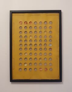 Mixed media – wasp nests, metal leaf, mirrors, canvas of linen, acrylic, plaster, 110″ x84″ x18″.